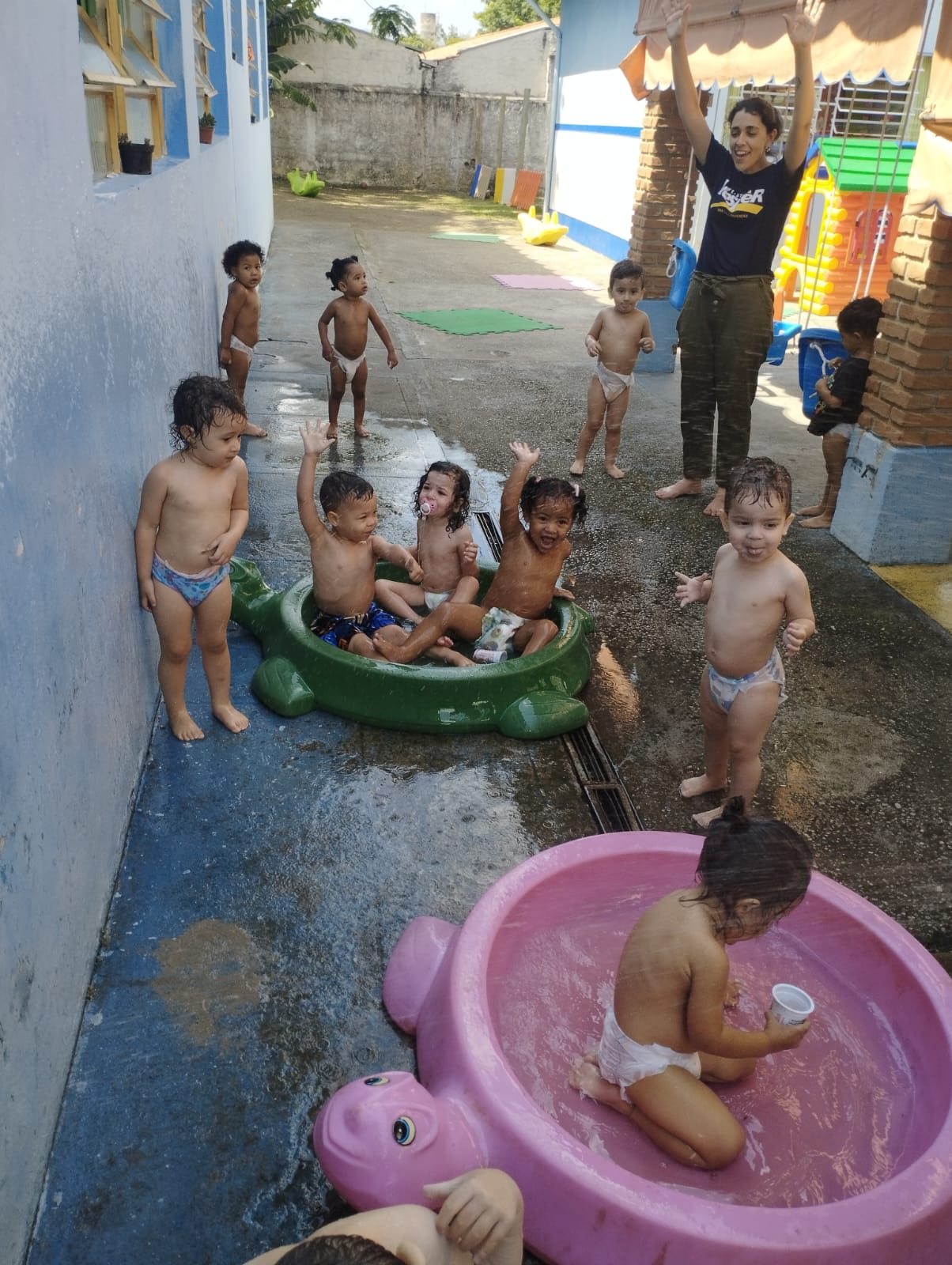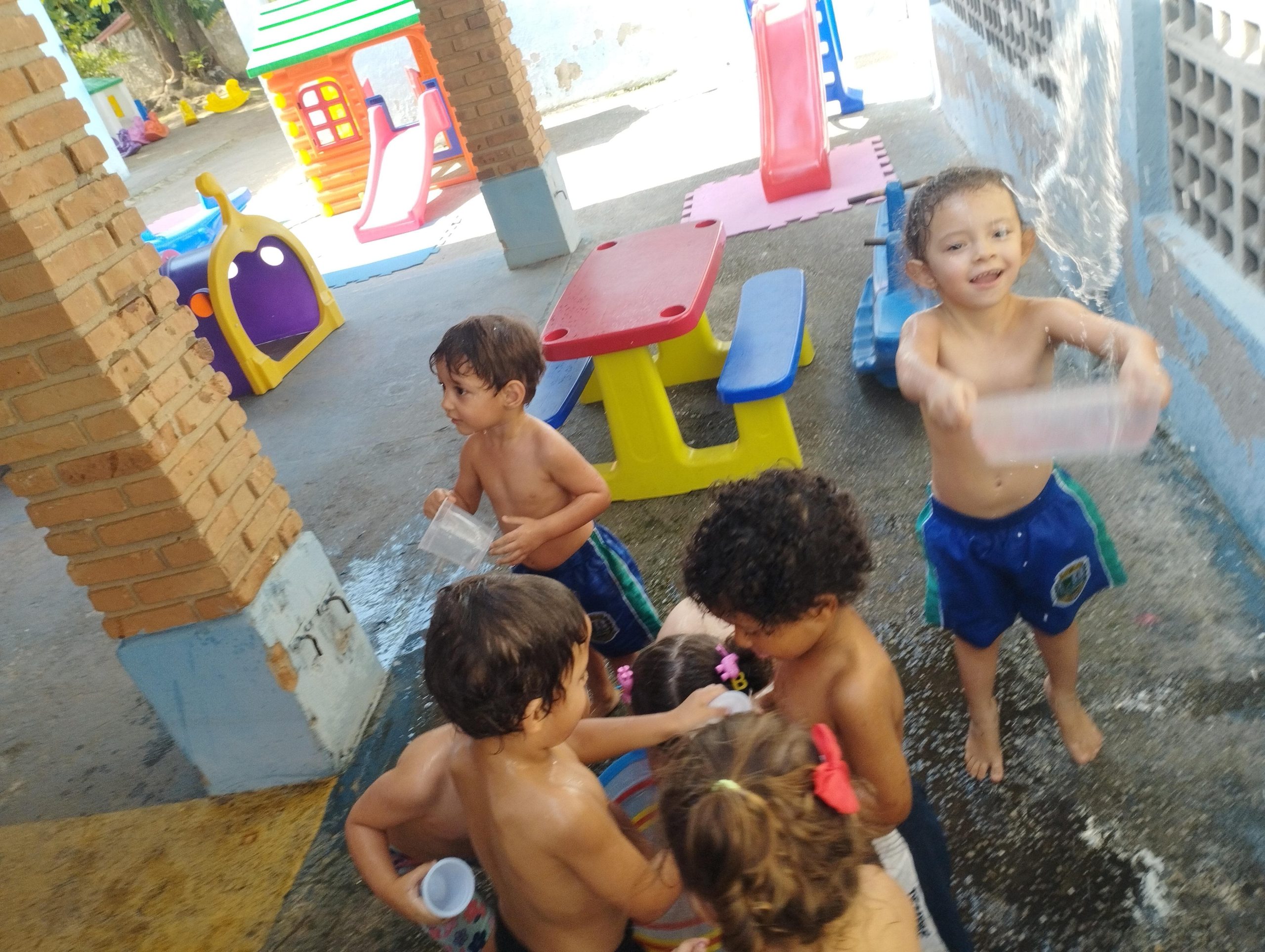 em uma tarde quente as crianças desenvolveram atividades com água para se desenvolver brincando e se refrescando